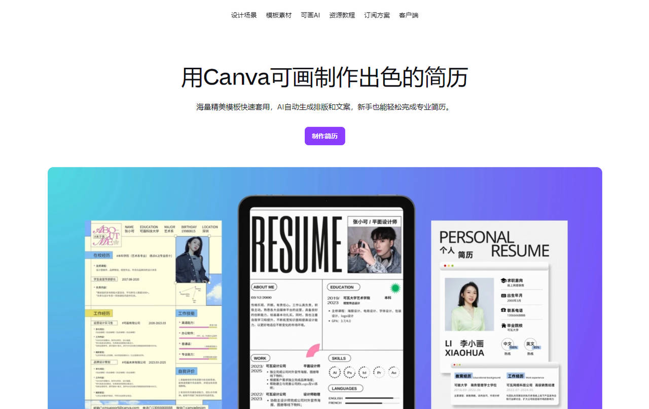 核心功能:Canva以图形设计能力为核心,提供海量创意简历模板。平台支持拖拽式操作,用户可以自由调整配色、字体和版式布局,添加正版图片和图标素材,实现高度个性化的简历设计。