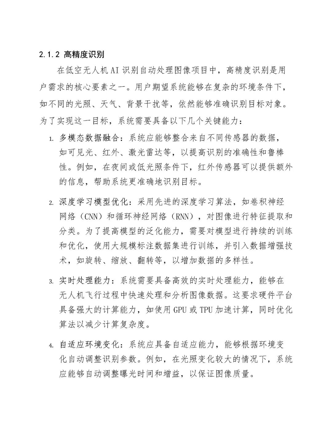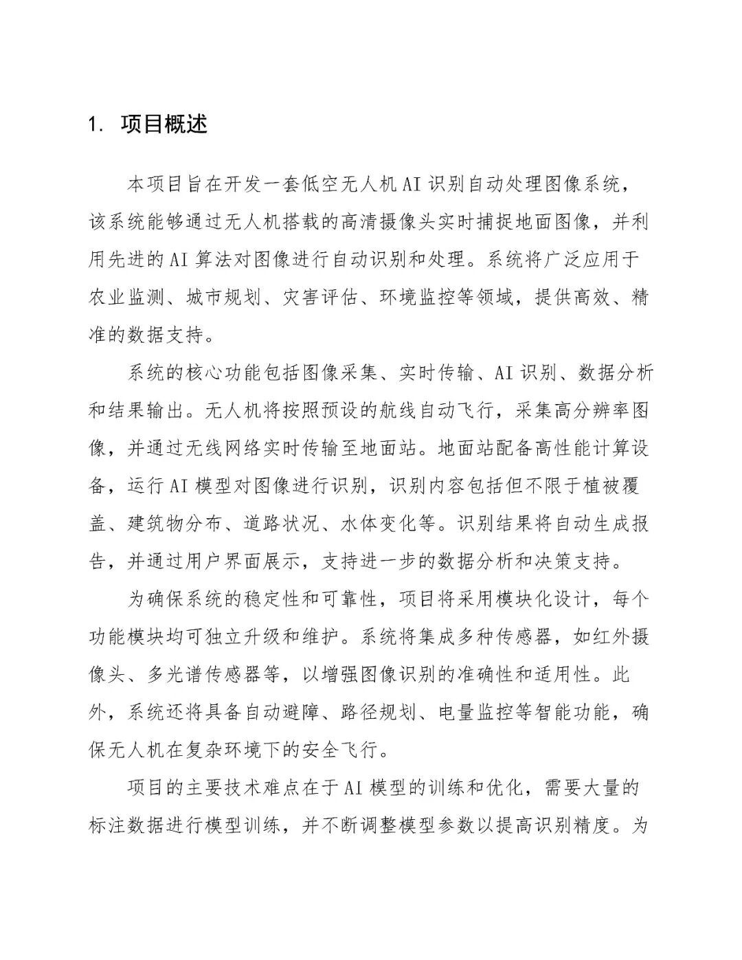 本方案构建了一套完整的低空无人机AI识别自动处理图像系统,覆盖从硬件选型、软件开发、系统集成到部署运维的全流程。系统以高精度识别、实时处理、模块化扩展为核心,具备多场景适应能力,能够显著提升图像采集与分析的自动化水平,为智慧农业、城市管理、应急响应等领域提供高效、可靠的技术支撑。项目预算合理,技术路径清晰,具备良好的推广价值和可持续发展潜力。