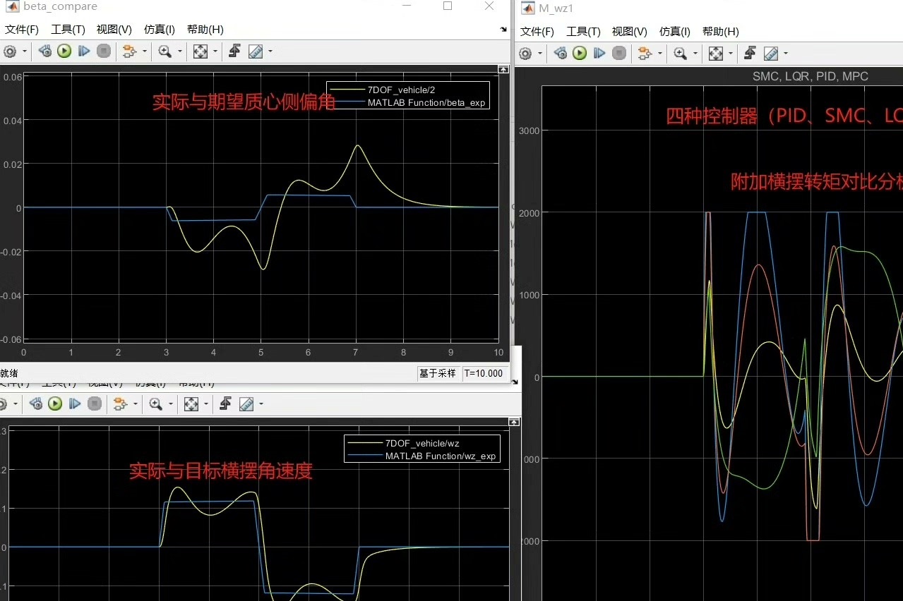 分布式驱动汽车稳定性控制这事儿,说白了就是让四个轮子各司其职还能协同作战。最近拿Simulink搭了个分层控制模型,上层用MPC、SMC、PID、LQR四个控制器搞决策,下层负责把力矩精准分配到每个轮胎。整套系统不仅能实时跟踪横摆角速度和质心侧偏角,还能随时切换对比不同控制策略——这可比实验室里焊电路板改参数痛快多了。