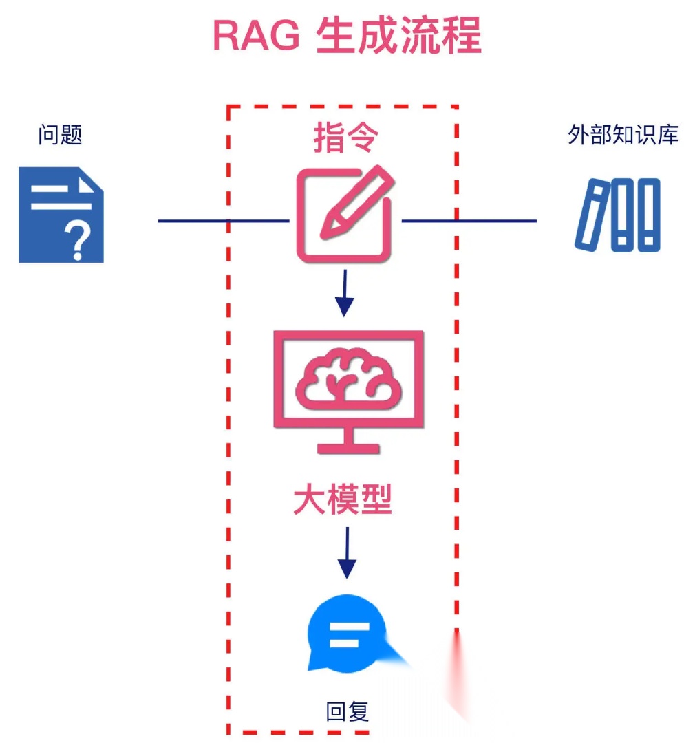 - 如下图所示,经过 RAG 索引流程外部知识的解析及向量化,RAG 检索流程语义相似性的匹配及混合检索,系统进入 RAG 生成流程。生成流程中,首先需要组合指令,指令将携带查询问题及检索到的相关信息输入到大模型中,由大模型理解并生成最终的回复,从而完成整个应用过程。