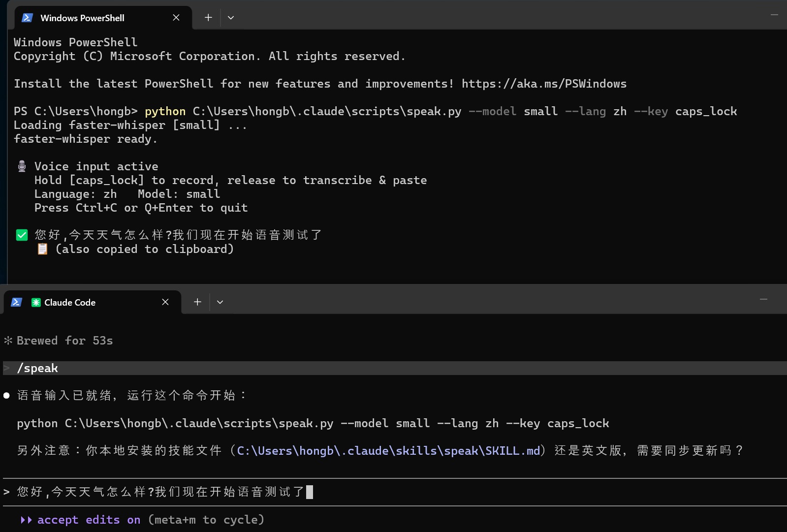 如果自动粘贴没生效,文字也会同时打印在 speak 终端里,手动复制就行。