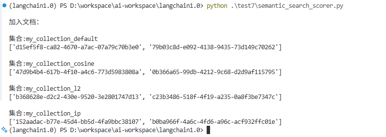 这一段结果可以看到是使用的cosine评分方式,Chroma 中返回的是 1-cosine_similarity,说明如果两个向量完全指向同一个方向,Score 是 0,如果完全正交(无关),Score 是 1。