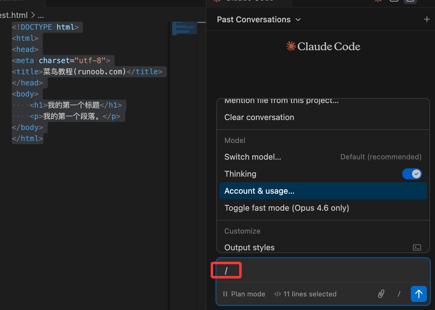 常用选项包括:附加文件、切换模型、开启扩展思考、查看使用量(输入 /usage)。