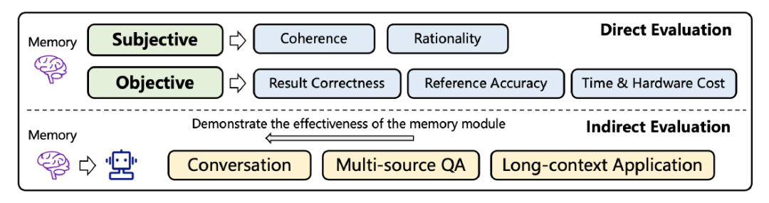 | 直接评估 | 客观指标 | 结果正确率 (Result Correctness) | 构造问答对测试记忆准确性 | ChatDB论文设置:从历史记录生成问题(如"Alice昨天去了哪里?"),选项A.故宫 B.长城,要求Agent仅基于记忆回答 | |