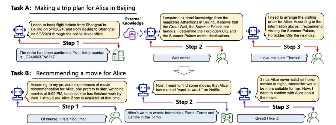如图所示,无论是帮Alice规划北京之旅(任务A),还是推荐电影(任务B),Agent都需要: