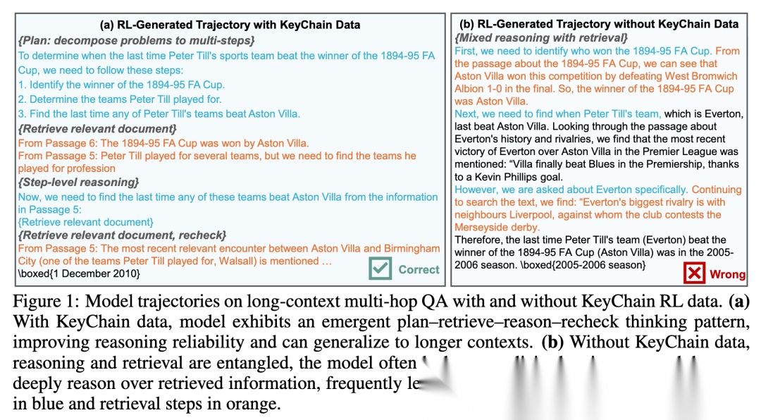 原文中特别提到了一个令人惊讶的发现:使用 KeyChain 数据进行强化学习训练,能让模型涌现出类似人类的长文本推理模式 (Emergent, human-like long-context reasoning patterns)。