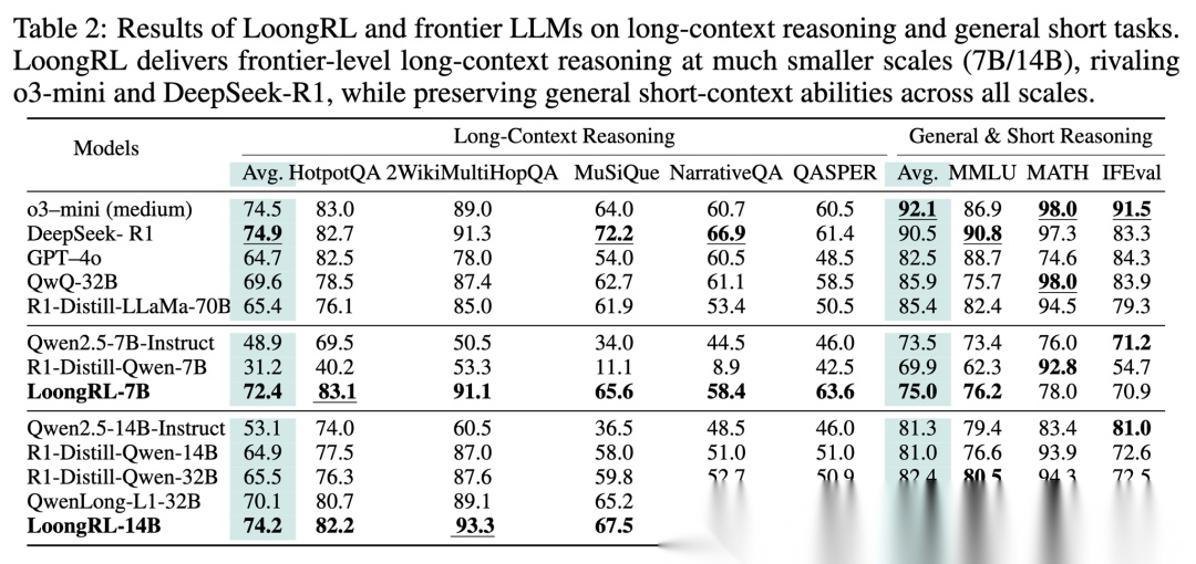 含义:LoongRL 让 14B 模型拥有了媲美顶级闭源模型的长文推理能力。