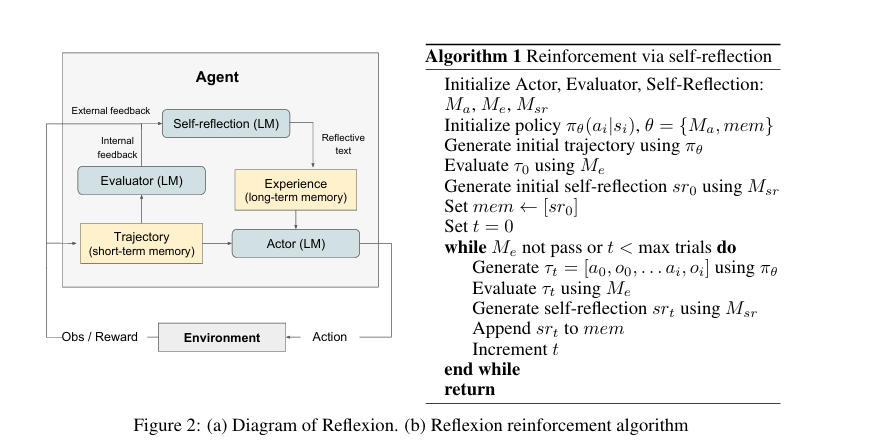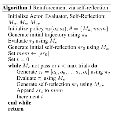 利用了三个不同的模型:一个行动者(Actor),记为 Ma,它生成文本和动作;一个评估者(Evaluator) 模型,记为 Me,它对 Ma 产生的输出进行评分;以及一个自我反思(Self-Reflection) 模型,记为 Msr,它生成语言化的强化线索