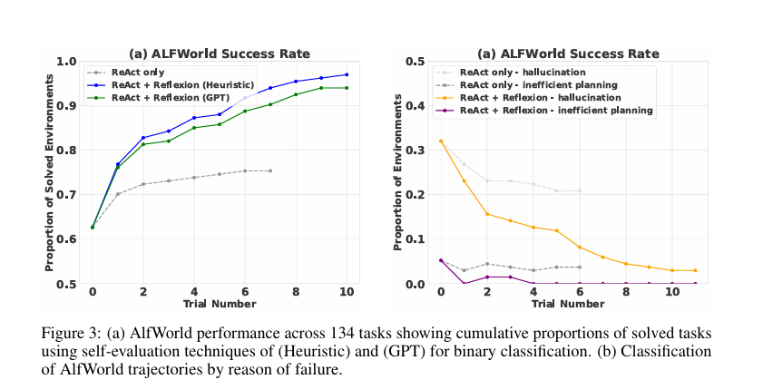 使用环境进行精确匹配答案评分,为智能体提供二元成功信号。每次试验后,采用自我反思循环来放大二元信号,记忆为最后三次反思