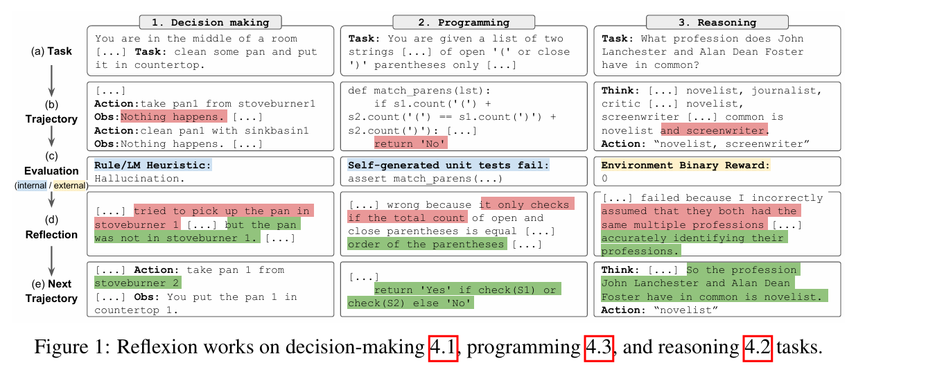 Reflexion 将来自环境的二元反馈或标量反馈转换为文本摘要形式的语言反馈,然后将其作为额外上下文添加到下一个回合的 LLM 智能体中。这种自我反思的反馈通过为智能体提供一个具体的改进方向来充当“语义”梯度信号,帮助它从先前的错误中学习,从而在任务中表现更好。