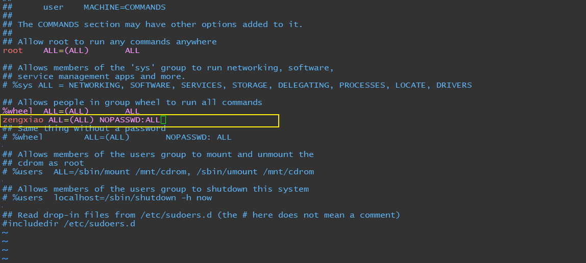 zengxiao ALL=(ALL) NOPASSWD:ALL