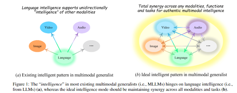 - 理想智能模式: 论文指出,理想的智能模式应当是所有模态和任务之间的协同增效(Synergy),而不是像当前大多数模型那样,仅仅将非文本模态作为语言模型的输入插件(即“语言智能主导”模式)。