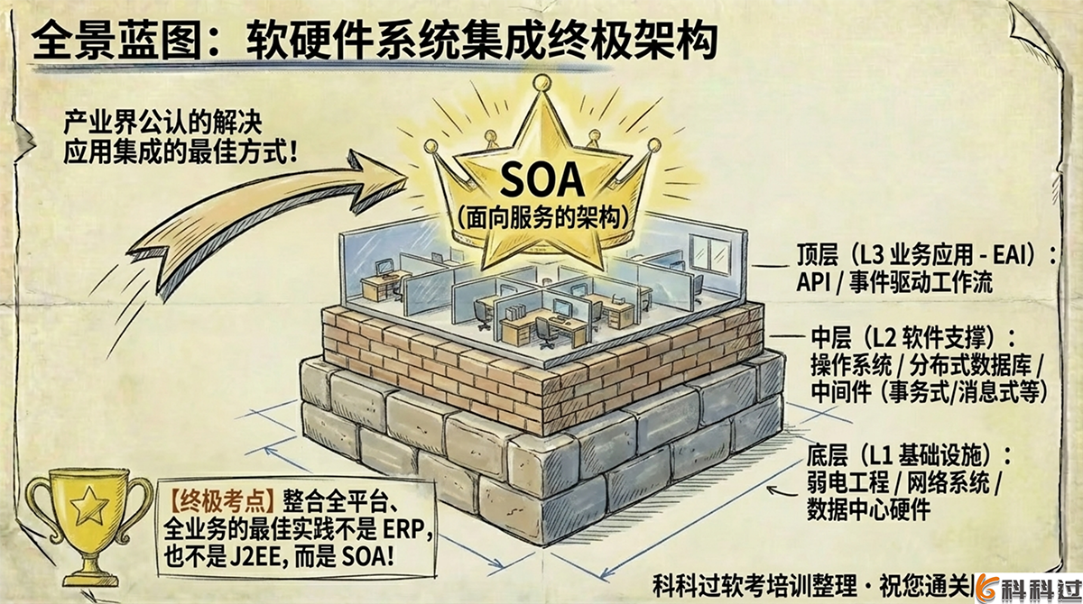 【核心内容摘要】本章系统介绍了软硬件系统集成的基础理论与核心技术。主要内容涵盖:系统集成基础(系统集成的概念、典型项目特点、信创与系统集成发展);基础设施集成(弱电工程的10大常见子系统、网络集成的5大子系统、数据中心机柜/服务器/存储/网络/安全设备的集成);软件集成(操作系统、分布式数据库、6类中间件的划分、流式与版式办公软件、应用软件集成的SOA架构及CORBA/COM/J2EE/.NET标准);业务应用集成(EAI的概念、技术要求、优势与工作原理)。