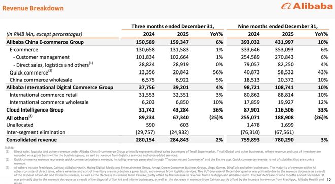 2026财年第三季度,阿里中国电商集团收入为1593.47亿元,同比增长+6%,占总收入55.9%,仍是阿里最核心的收入来源。