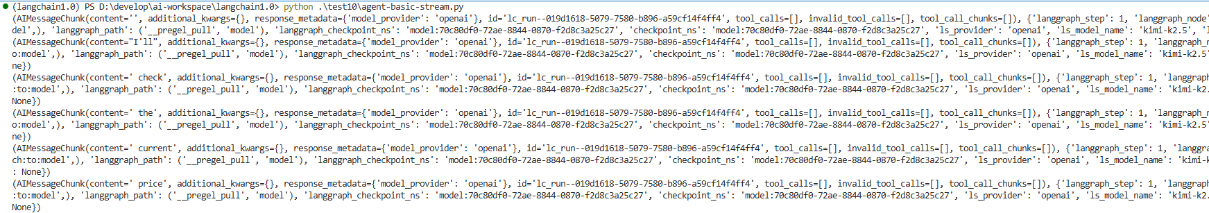 小技巧: 在 values 模式下,由于每次迭代都会返回整个消息历史,如果我们遍历整个列表打印,会导致前面的内容被重复打印。因此,通常我们只打印 messages[-1],即当前步骤最新产生的消息。如下所示: