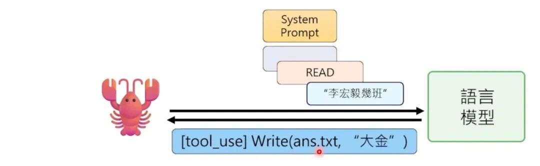 在这个例子里面,语言模型传回来的工具指令是把“大金”两个字写到 answer.txt 里面。然后龙虾就直接执行这一行指令,把“大金”这两个字写到档案里面。