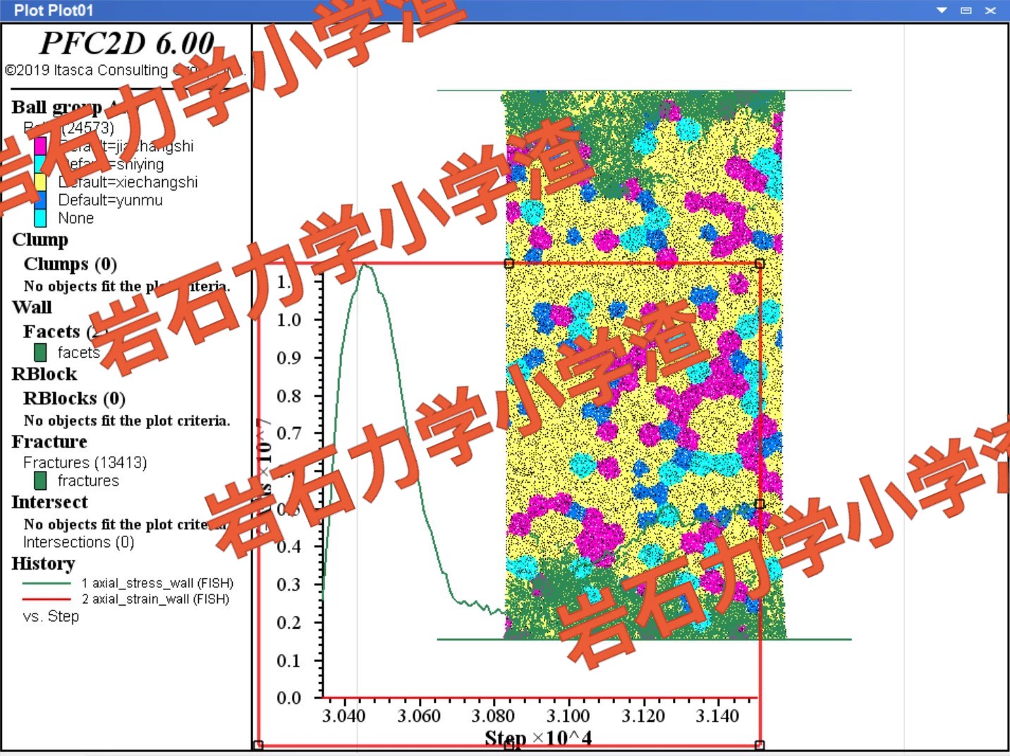fish history命令记录两个核心指标:一是轴向应力(由axialstresswall函数基于墙体接触力与横截面面积计算),二是轴向应变(由axialstrainwall函数基于墙体位移与试样高度计算),形成应力-应变曲线的基础数据;同时调用断裂监测脚本(fracture.p2fis),开启裂纹数量(crack_num)的实时监测。 - 加载终止条件与模型保存:设置加载终止条件为“应力降至峰值应力的30%”(