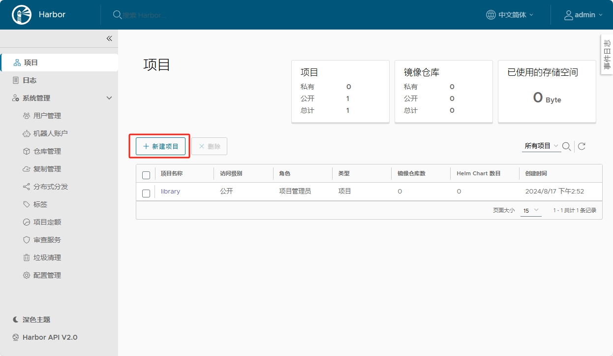4. 访问Harbor UI:http/https://Harbor服务器IP,用admin密码登录
