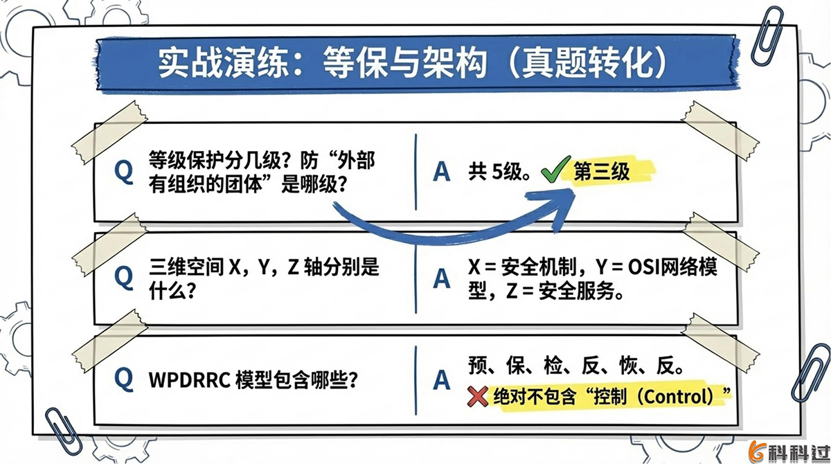 详细解析:宏观三维空间图中,X轴是“安全机制”(包含基础设施、平台、数据安全等);Y轴是“OSI网络参考模型”(物理层到应用层);Z轴是“安全服务”(如对等实体认证、访问控制等)。