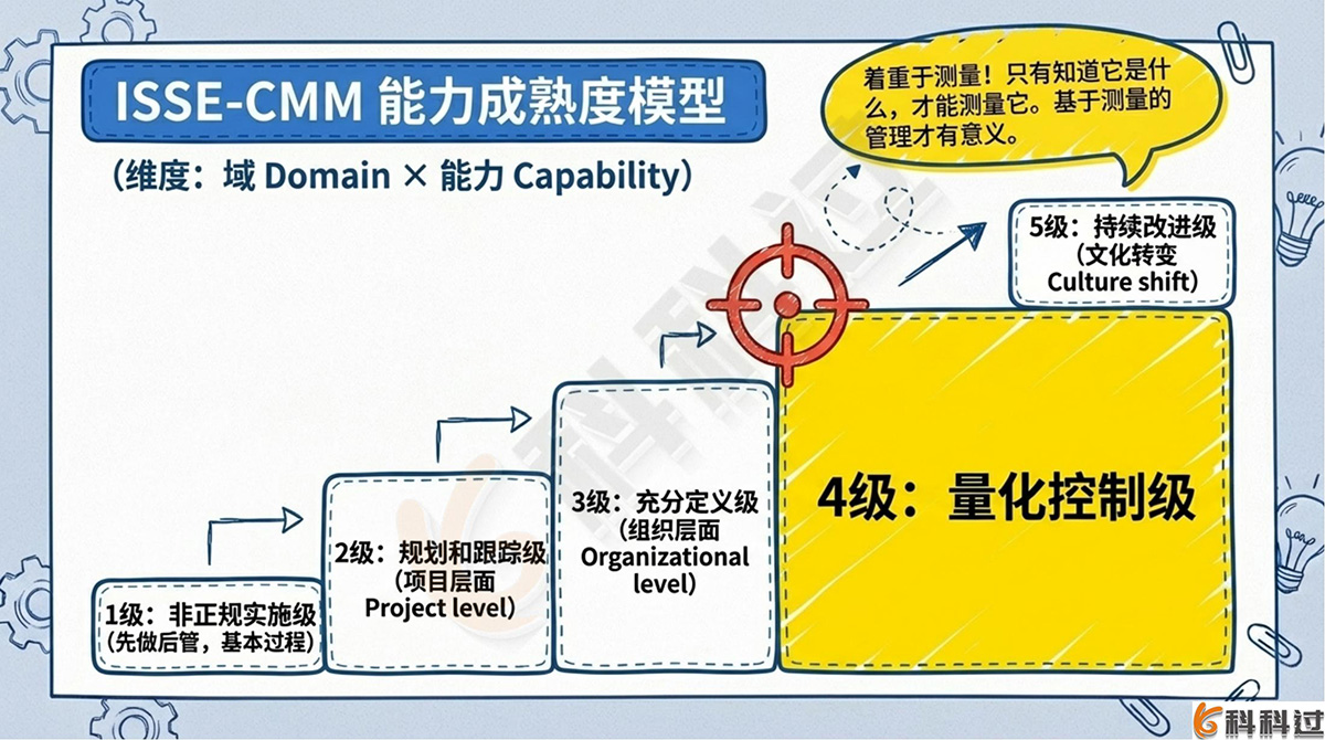详细解析:Level 4(量化控制级) 的重点是着重于测量,测量是与组织业务目标紧密联系在一起的。其能力特点是“只有知道它是什么,才能测量它。当被测量的对象正确时,基于测量的管理才有意义”。