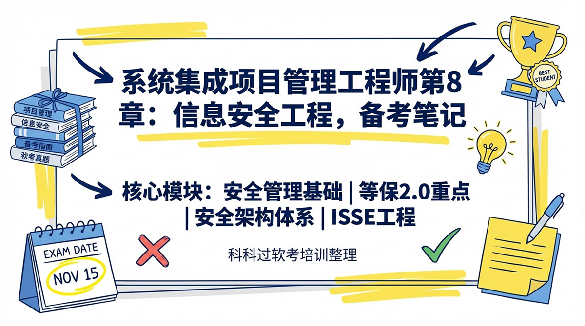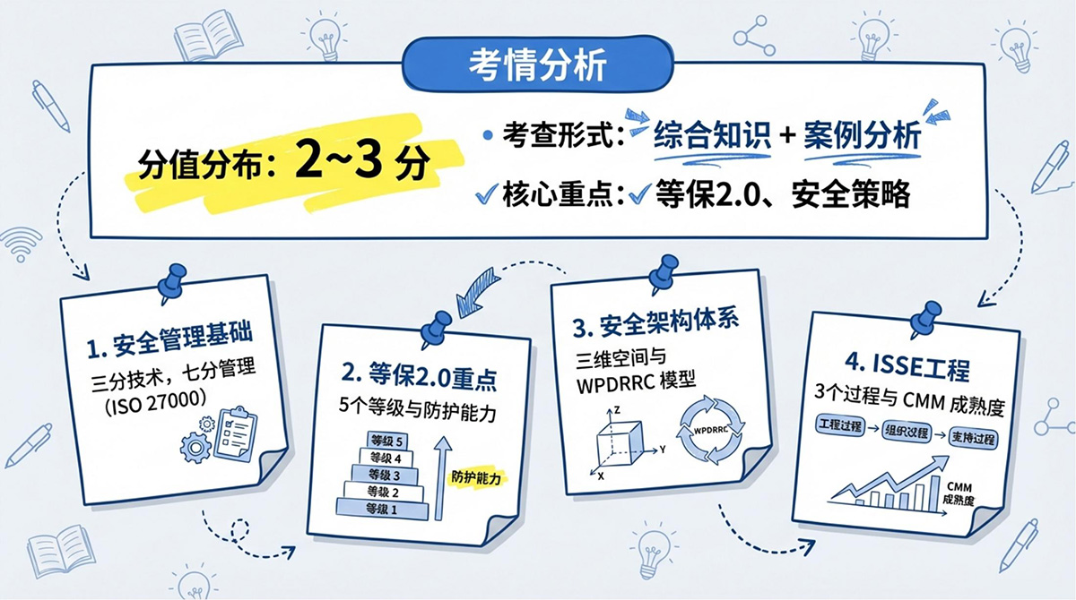 根据最新考纲及《系统集成项目管理工程师第3版章节占分比》分析,本章节 “第8章:信息安全工程” 在2024下半年至2025上半年(新大纲稳定期)的考查占分为 2~3 分。考查形式包含综合知识+案例分析。趋势分析指出,本章的重点内容主要集中在等保2.0、安全策略等。