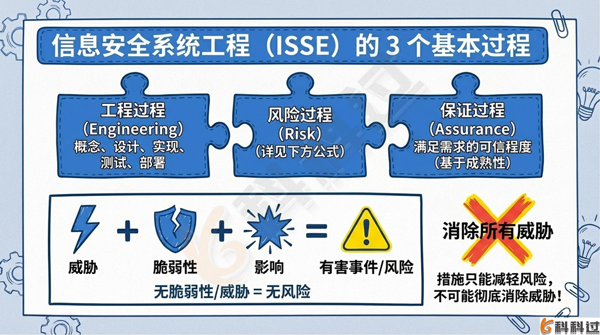 详细解析:ISSE将信息安全系统工程实施过程分解为工程过程 (Engineering Process)、风险过程 (Risk Process) 和保证过程 (Assurance Process) 3个基本的部分。