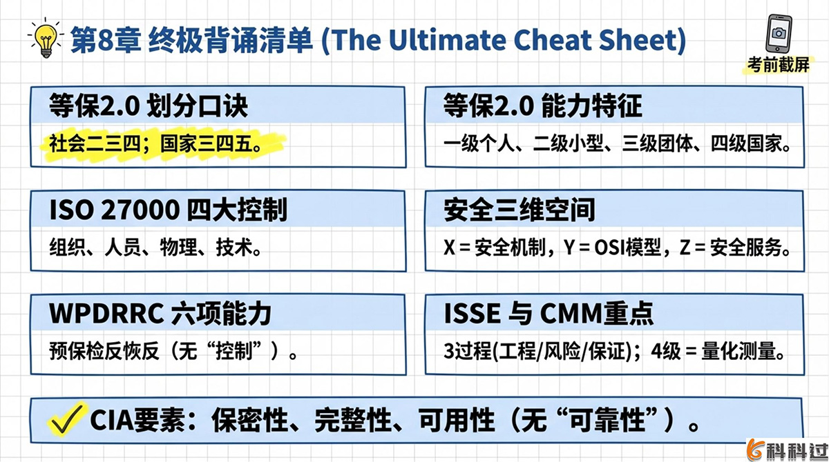 【核心内容摘要】本章系统阐述了信息安全工程的体系建设。主要内容涵盖:信息安全管理(三分技术、七分管理,ISO/IEC 27000系列包含的组织、人员、物理、技术四大控制方面);等级保护(等保2.0的五个安全保护等级及对应的防护能力,技术与管理变更);信息安全系统(宏观三维空间架构:安全机制、OSI网络参考模型、安全服务,以及WPDRRC信息安全保障体系);信息安全系统工程体系架构(ISSE实施的三个过程:工程过程、风险过程、保证过程,以及衡量工程实施能力的ISSE-CMM五个成熟度级别)。