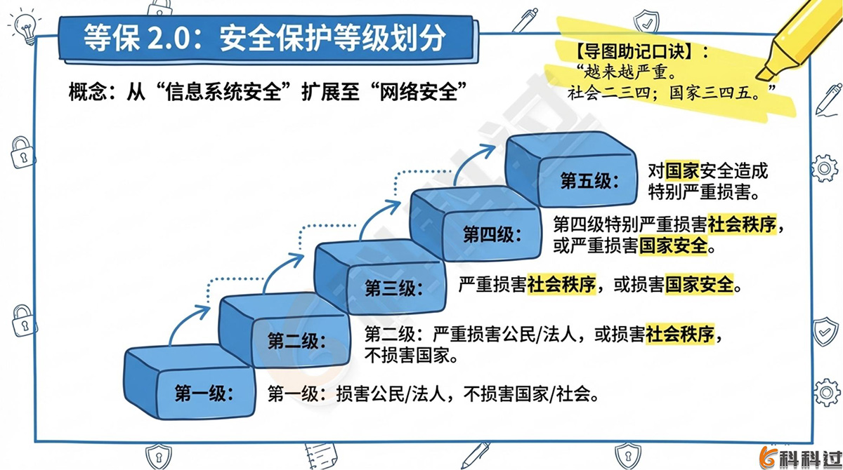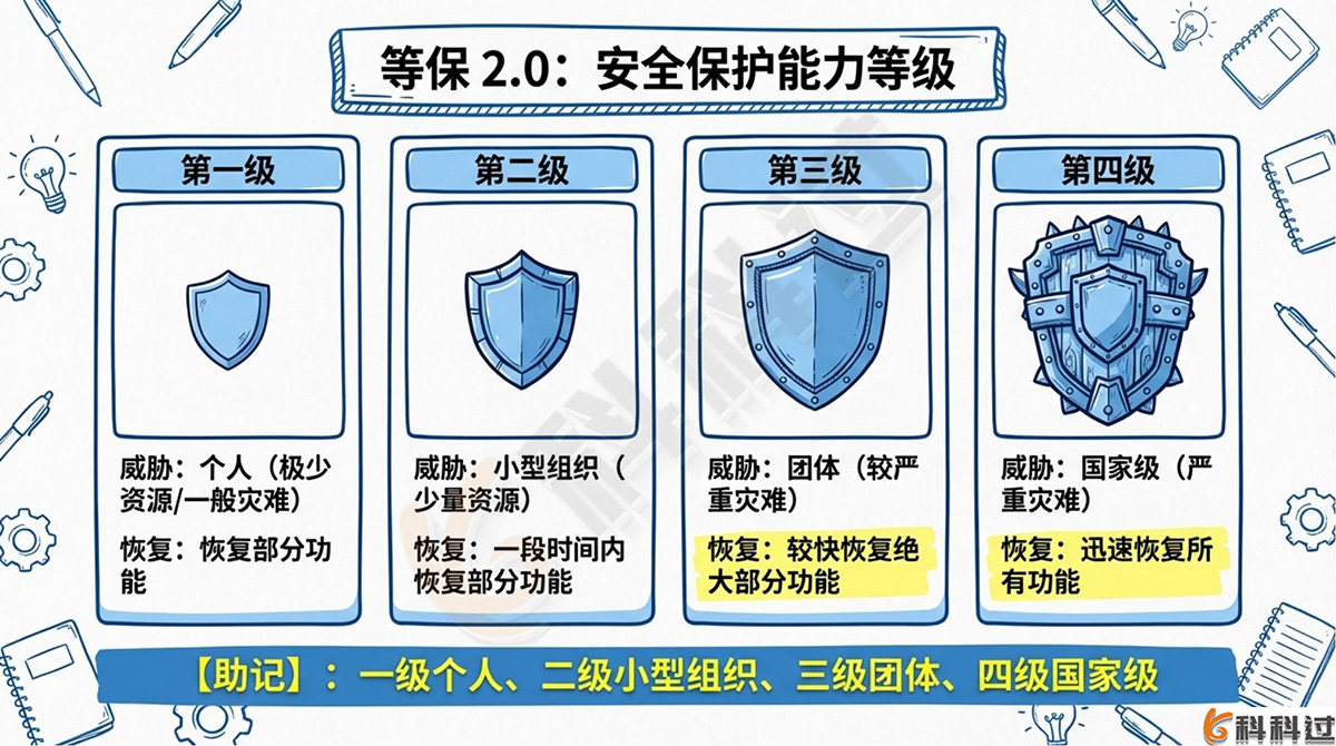 【导图助记提示】:级别越高,防护能力越强。概括为:一级个人、二级小型组织、三级团体、四级国家级。