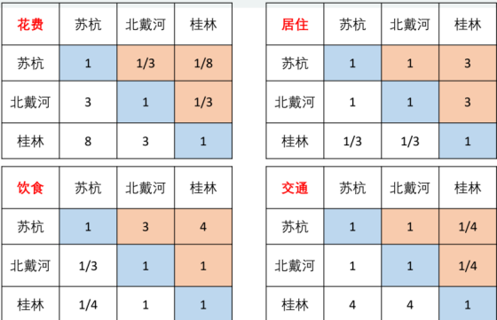依然以旅游为例,那么我们首先需要确定各个旅游地的各因素评分: