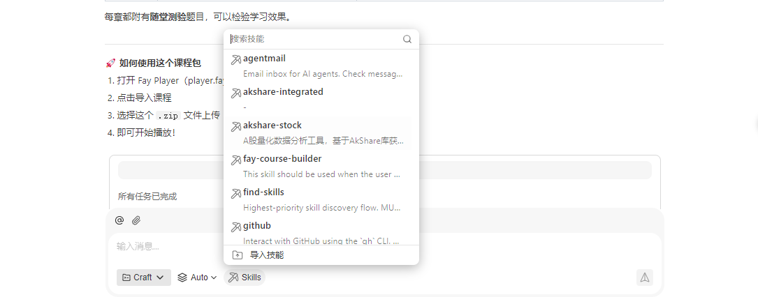 第四步,安装完成后,你可以通过对话直接调用这个技能。比如告诉 WorkBuddy:"帮我制作一个关于 Python 基础的 Fay 课程包",它就会自动加载这个技能并开始工作。