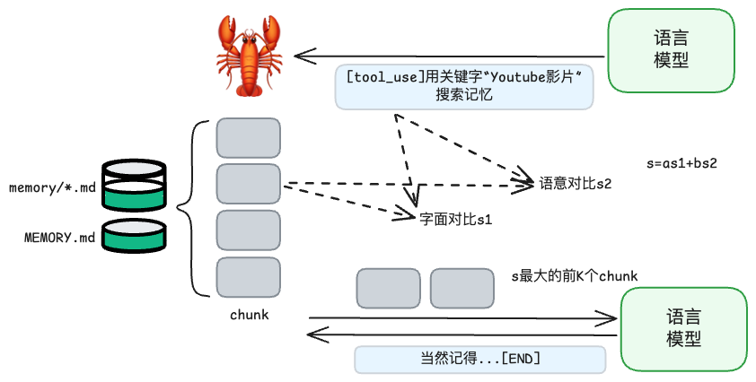 龙虾会将 MEMORY.md 和 memory/*.md 切成多个 chunk ,每个 chunk 里就是一段文字。当语言模型搜索一段内容时,龙虾会将每个 chunk 的内容与搜索内容做相似度比对(预设包括字面比对和语意比对)并排序,取出相似度最大的前 K 个 chunk 传给语言模型,这样语言模型就好像是记起来了之前的事情。