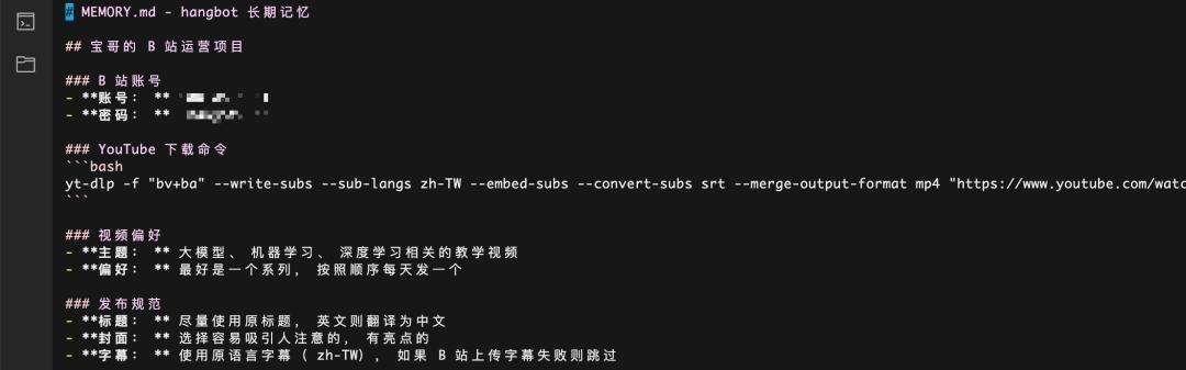 MEMORY.md:龙虾的记忆,例如他经营的 B 站账号、任务细则等。