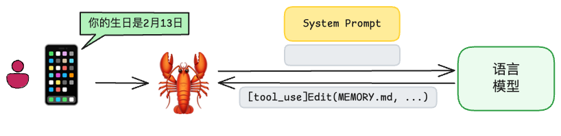 但是有些比较弱的模型,可能会光说不练。你告诉它让它记住……然后龙虾将这句话发给语言模型,有的语言模型比较弱,它可能并不会发送指令给龙虾,让它编辑 MEMOERY.md 文档,而是简单回复“没问题,一定牢牢记住”。
