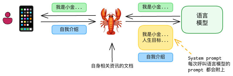 接着上面的一轮对话完成后,进行第二轮对话时龙虾会将上一轮对话的上下文再加上本轮对话的输入一起发送给语言模型,得到语言模型的回复,因为语言模型并不知道之前发生了什么。