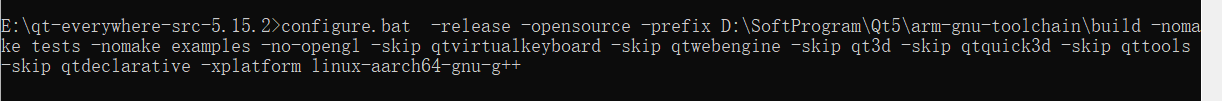 configure.bat -release -opensource -prefix D:\SoftProgram\Qt5\arm-gnu-toolchain\build -nomake tests -nomake examples -no-opengl -skip qtvirtualkeyboard -skip qtwebengine -skip qt3d -skip qtquick3d -skip qttools -skip qtdeclarative -xplatform linux-aarch64-gnu-g++