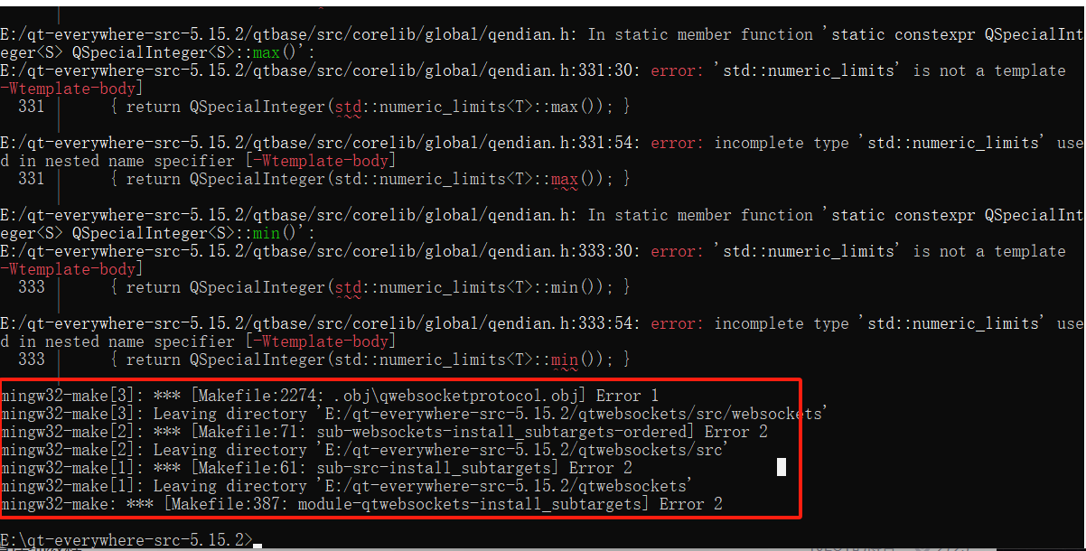 5.编译成功后(无打印Error信息)执行安装命令 mingw32-make install(其中安装路径是上述配置中的 -prefix 后路径),安装完成后可能会存在报错,如果qmake.exe已经生成可以忽略不管。