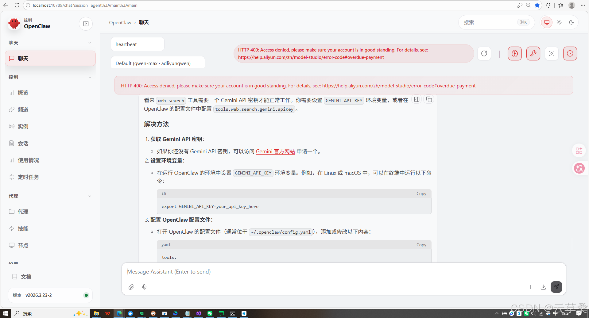 配置完成后,OpenClaw 就会调用阿里云百炼的 API,而不是本地模型了。继续填写就对了!