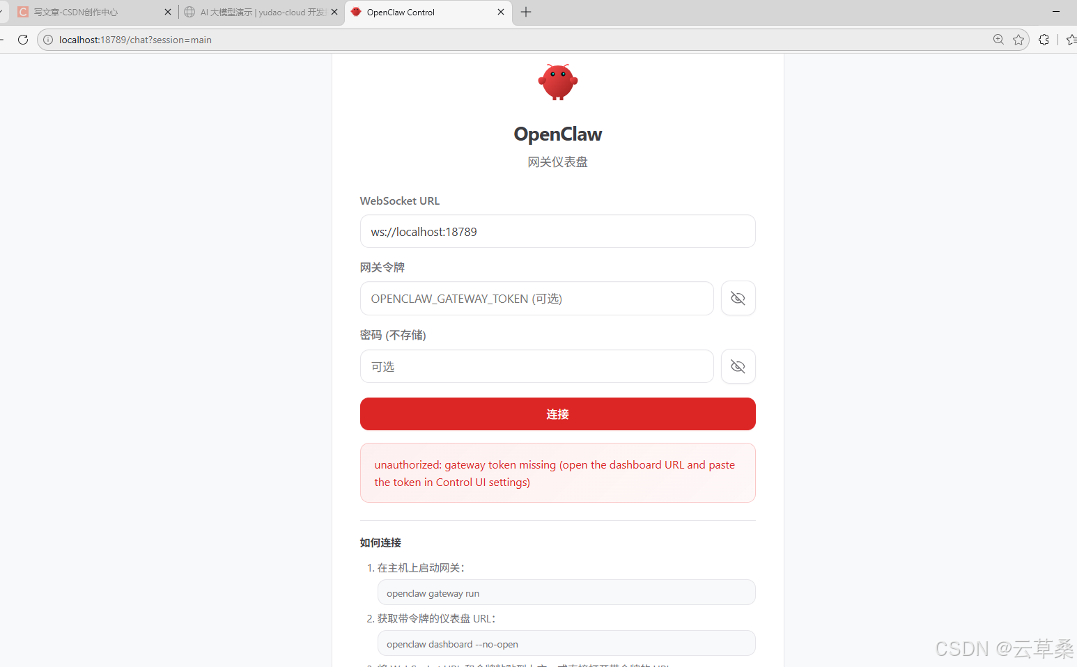 诊断:网关认证已关闭或缺少令牌(Token)。令牌认证是目前推荐的默认安全方式(包括本地回环通信)。
