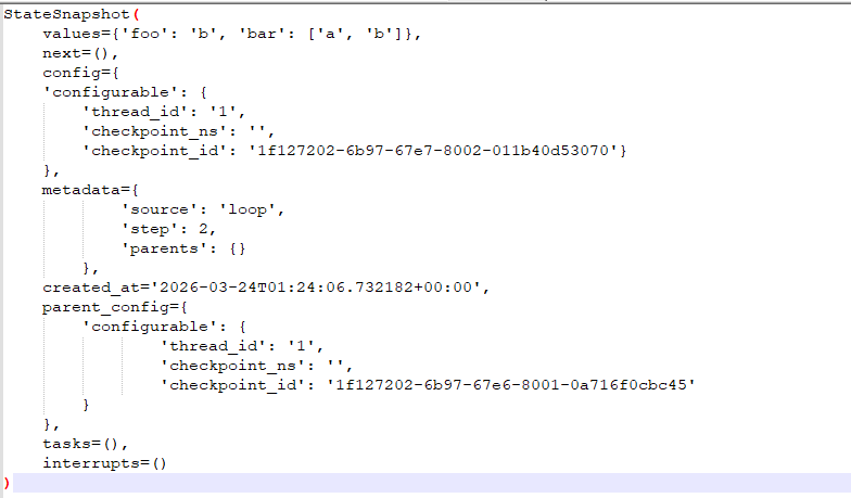 interrupts: 记录当前的“中断”。如果你设置了人工审批流程(Human-in-the-loop),当程序停下来等你点击“批准”时,这里会显示中断的原因。