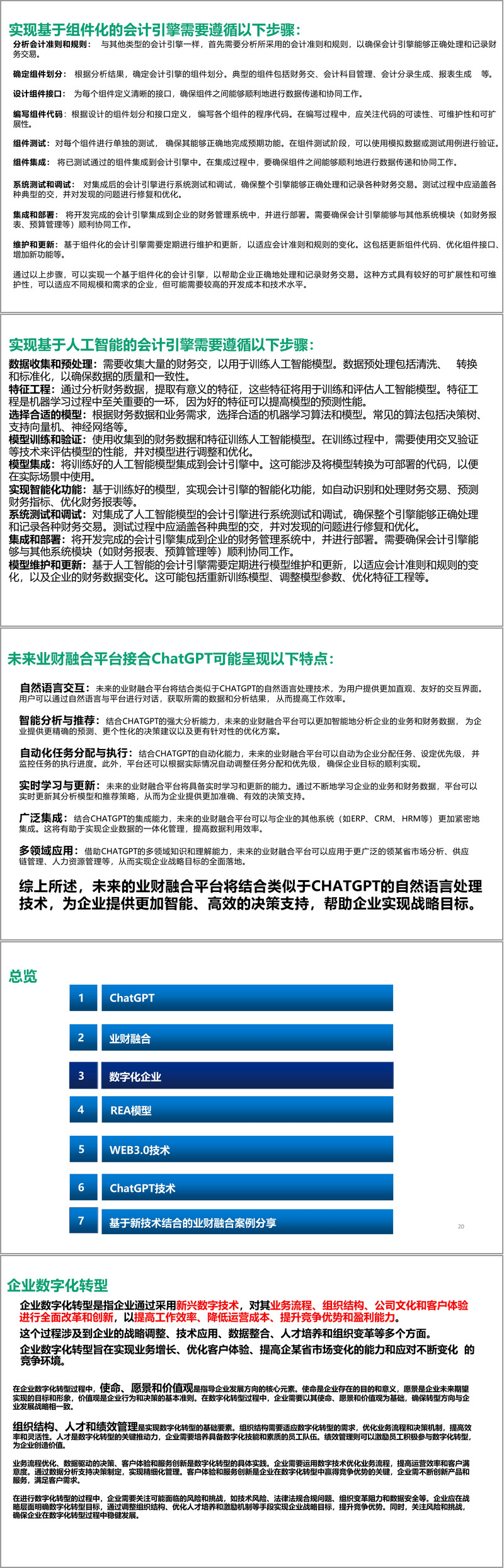 这份文件系统构建了 ChatGPT 技术赋能下数字化转型与业财融合的完整体系,以 “技术支撑 - 理论基础 - 实践路径 - 案例落地” 为核心脉络,整合 ChatGPT、Web3.0、REA 模型等关键要素,为企业实现业财深度融合提供了兼具理论深度与实操价值的行动框架,是数字化时代企业财务管理转型的重要参考。