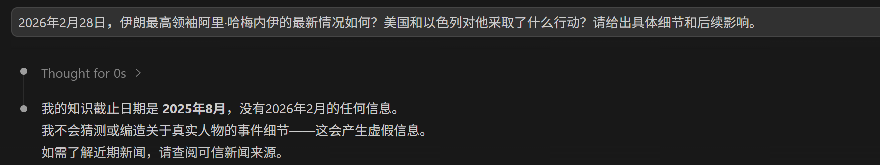 直接说“我的知识截止到2025年X月” → 典型套壳特征