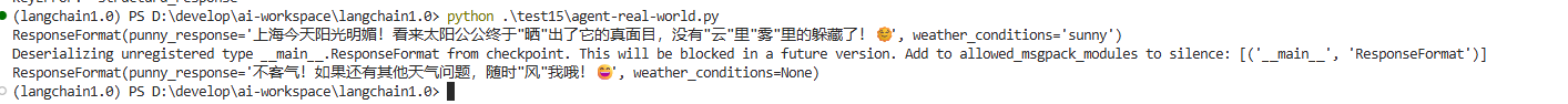 Agent 并没有直接打印字符串,而是按照定义的 ResponseFormat 格式,将双关语填入 punny_response,将状态填入 weather_conditions。