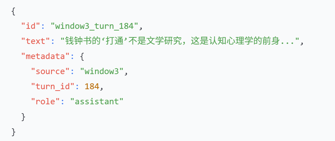 RAG构建的第一步是将对话切分成适合检索的文本块。我们采用按轮次分块的策略:每个对话轮次(turn)独立成为一个文本块。