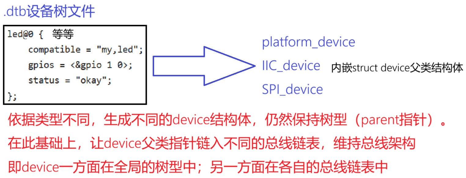 当内核读取设备树的信息后,会把他们解析成struct device结构体(这一步只是把文本信息翻译成结构体,本质仍然是树)。不过这个struct device只是父类,由于总线架构中有多种总线类型:IIC、SPI、Platform等,所以真正生成的结构体黑丝是struct device的子类,而把struct device作为公共部分及后续链表的节点标记。