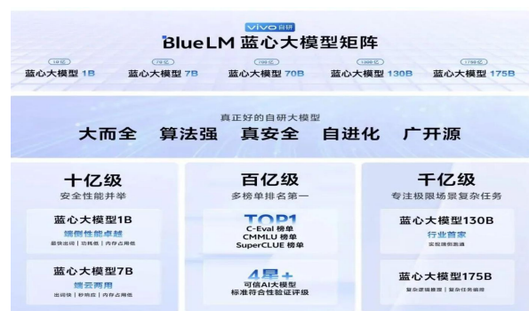 蓝心大模型是行业首个在手机端运行的开源自研大模型,也是更适合中文用户的中文开源大模型,其包含十亿、百亿、千亿三个参数量级,共 5 款自研大模型(10 亿、70 亿、700 亿、1300 亿和 1750 亿)。随着参数提升,蓝心大模型逐渐具备文本总结、语言理解、文本创作、知识问答、角色扮演、复杂逻辑推理、复杂任务编排等能力。基于蓝心大模型能力,vivo 开发出蓝心小 V 和蓝心千询两款手机端产品。