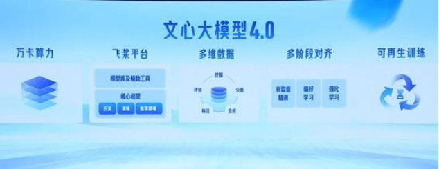 文心大模型 4.0 的能力提升源自相关举措:(1)在万卡算力上基于飞桨平台,通过集群基础设施和调度系统、飞桨框架的软硬协同优化,支持了大模型的稳定高效训练。(2)通过建设多维数据体系,形成了从数据挖掘、分析、合成、标注到评估闭环,充分提高数据的利用效率,大幅提升模型效果。(3)基于有监督精调、偏好学习、强化学习等技术进行多阶段对齐,保证了模型能够更好地与人类的判断和选择对齐。(4)利用可再生训练技术通过增量式的参数调优,有效节省了训练资源和时间,加快了模型迭代速度。