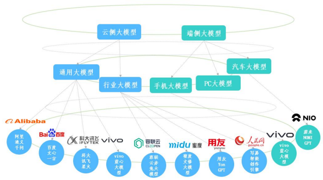当前,我国 AI 大模型产业呈现蓬勃发展的态势。伴随多家科技厂商推出的AI 大模型落地商用,各类通用、行业以及端侧大模型已在多个领域取得了显著的成果,如在金融、医疗、政务等领域,AI 大模型已成为提升服务质量和效率的重要手段。我国具有代表性的通用 AI 大模型主要包含科大讯飞的讯飞星火认知大模型、百度公司的文心一言大模型、阿里巴巴的通义千问大模型等;行业AI 大模型主要涵盖蜜度的文修大模型、容联云的赤兔大模型、用友的 YonGPT大模型;同时具有云侧和端侧大模型的端云结合 AI 大模型主要有 vivo 的蓝心大模型;端侧 AI 大模型主要以蔚来的 NOMI GPT 大模型为代表。