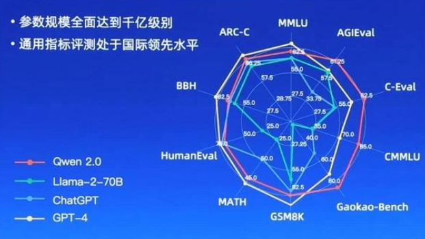 2023 年 10 月,千亿级参数大模型通义千问 2.0 发布,相比 1.0 版本,其在复杂指令理解、文学创作、通用数学、知识记忆、幻觉抵御等能力上均有显著提升。中英文理解能力是大语言模型理解和表达的基础能力,英语任务中,通义千问 2.0 的 MMLU(伯克利大学、哥伦比亚大学等联合发布)基准得分是 82.5。中文任务中,通义千问 2.0 在模型训练中学习了更多中文语料,在 C-EVAL(上海交大和清华联合研发的中文大语言模型测试集)基准上获得最高分;数学推理方面,在推理基准测试 GSM8K(OpenAI 发布的小学数学测试集)中,通义千问排名第二,展示了强大的计算和逻辑推理能力;代码理解方面,HumanEval(OpenAI发布)测试衡量大模型理解和执行代码片段的能力,通义千问排名第三,这一能力是大模型在编程辅助、自动代码修复等场景的基础。