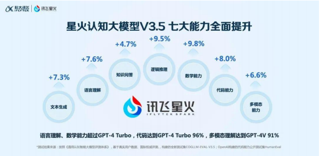 2024 年 1 月,讯飞星火认知大模型 V3.5 发布,七大核心能力全面提升。据科大讯飞宣称,数学、语言理解超 GPT-4 Turbo,在代码能力方面已经达到GPT-4Turbo 的 96%。另外,星火大模型在多模态理解方面达到 GPT-4V 的 91%,其中语音的多模态能力已经超过 GPT-4。