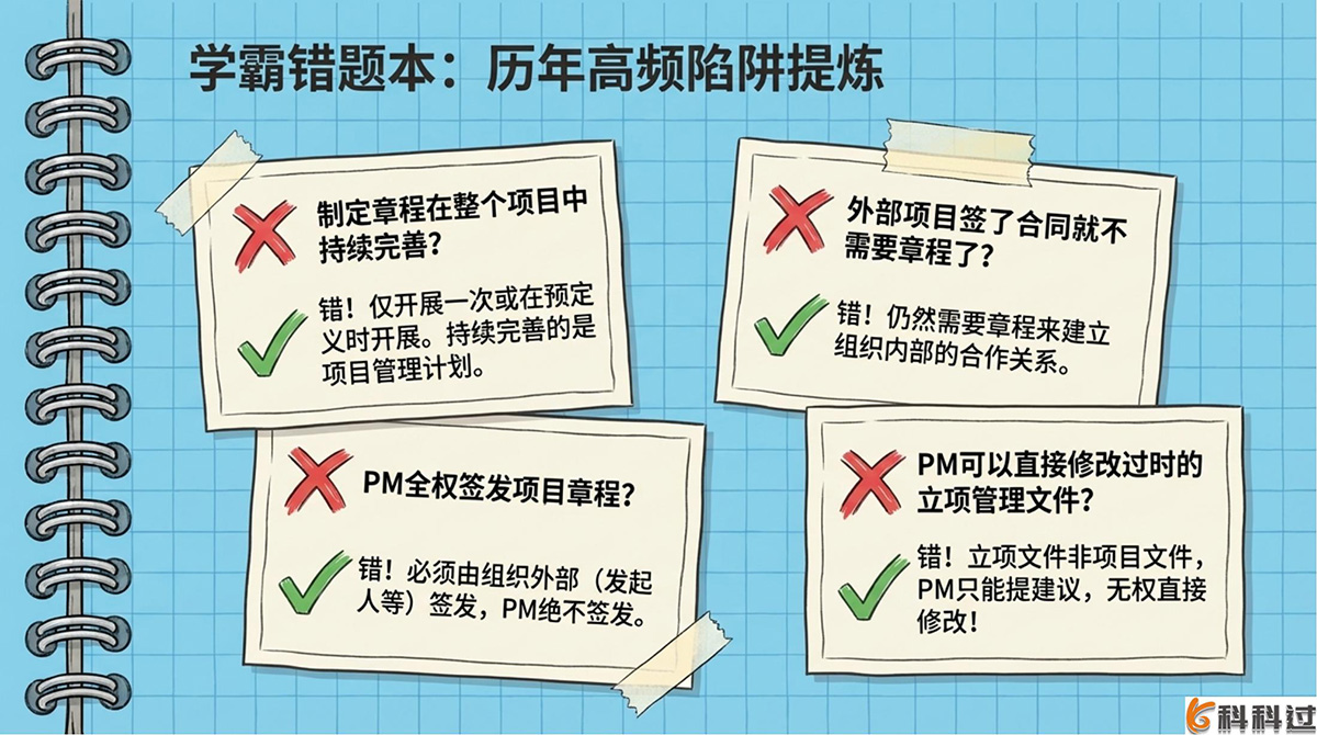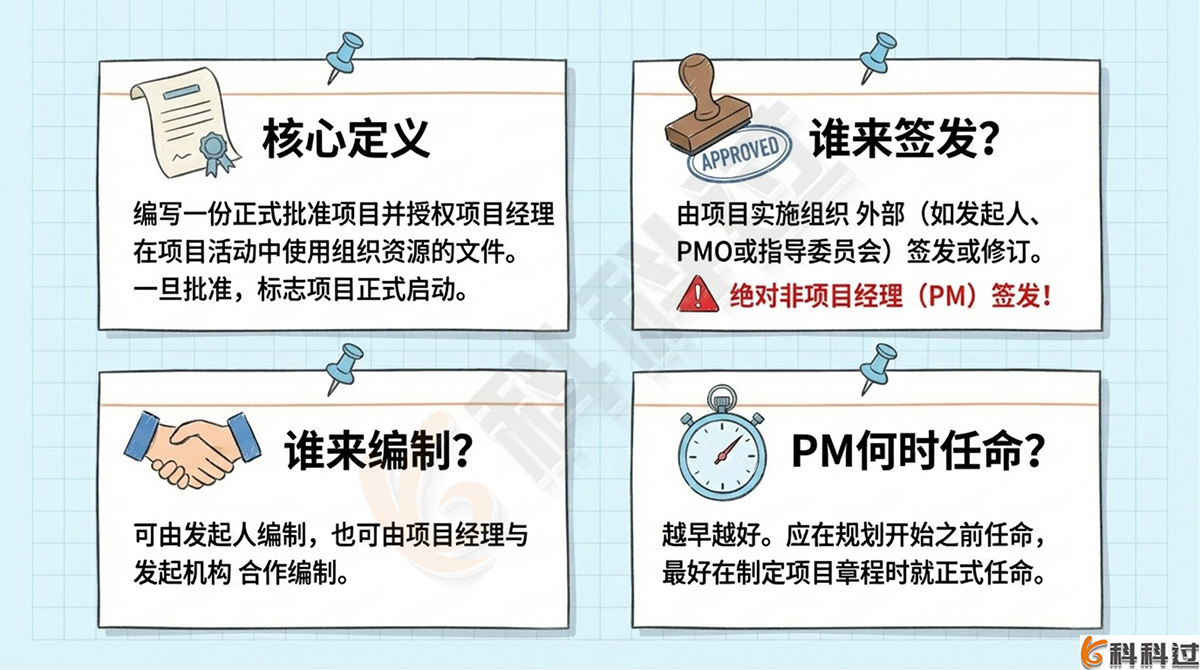 - 制定项目章程的三大关键:谁签发(外部)、谁编制(可合作)、何时任命项目经理(越早越好)